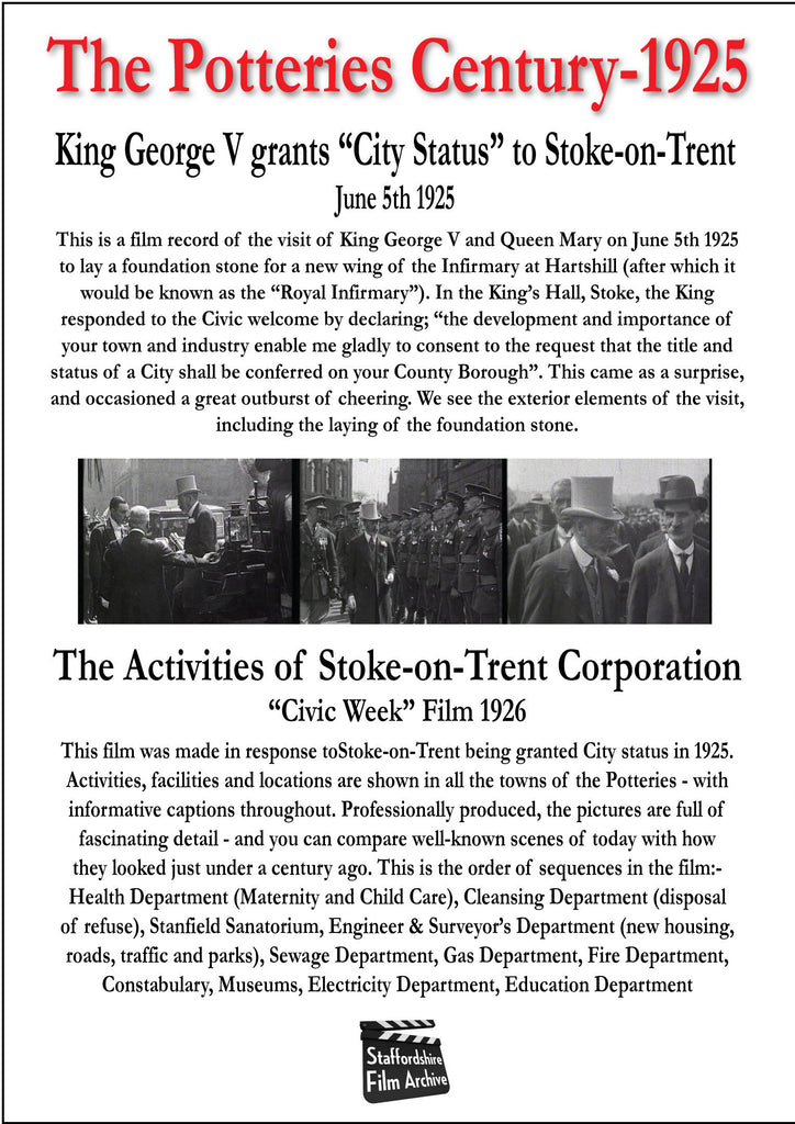 The film was made in response to Stoke-on-Trent being granted City Status in 1925 by George V (newsreel of this occasion is on “Stoke-on-Film, 1900-1930”).